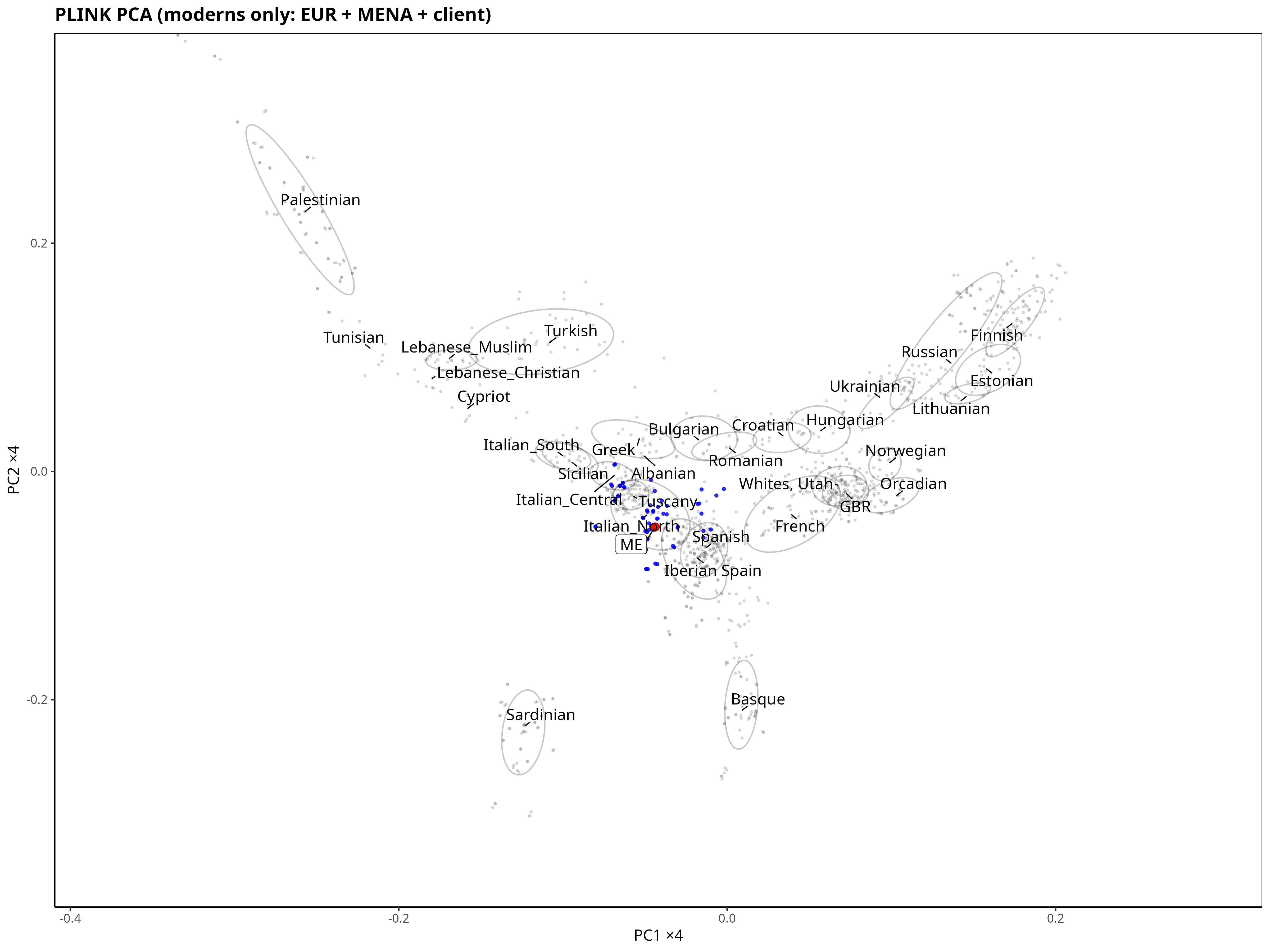The Iberian sample largely overlaps the North Italian one, but it sits slightly more to the west relative to the North Italian centroid. My genome is also shifted a little northwest of the North Italian centroid, but it still falls well inside the North Italian cluster.