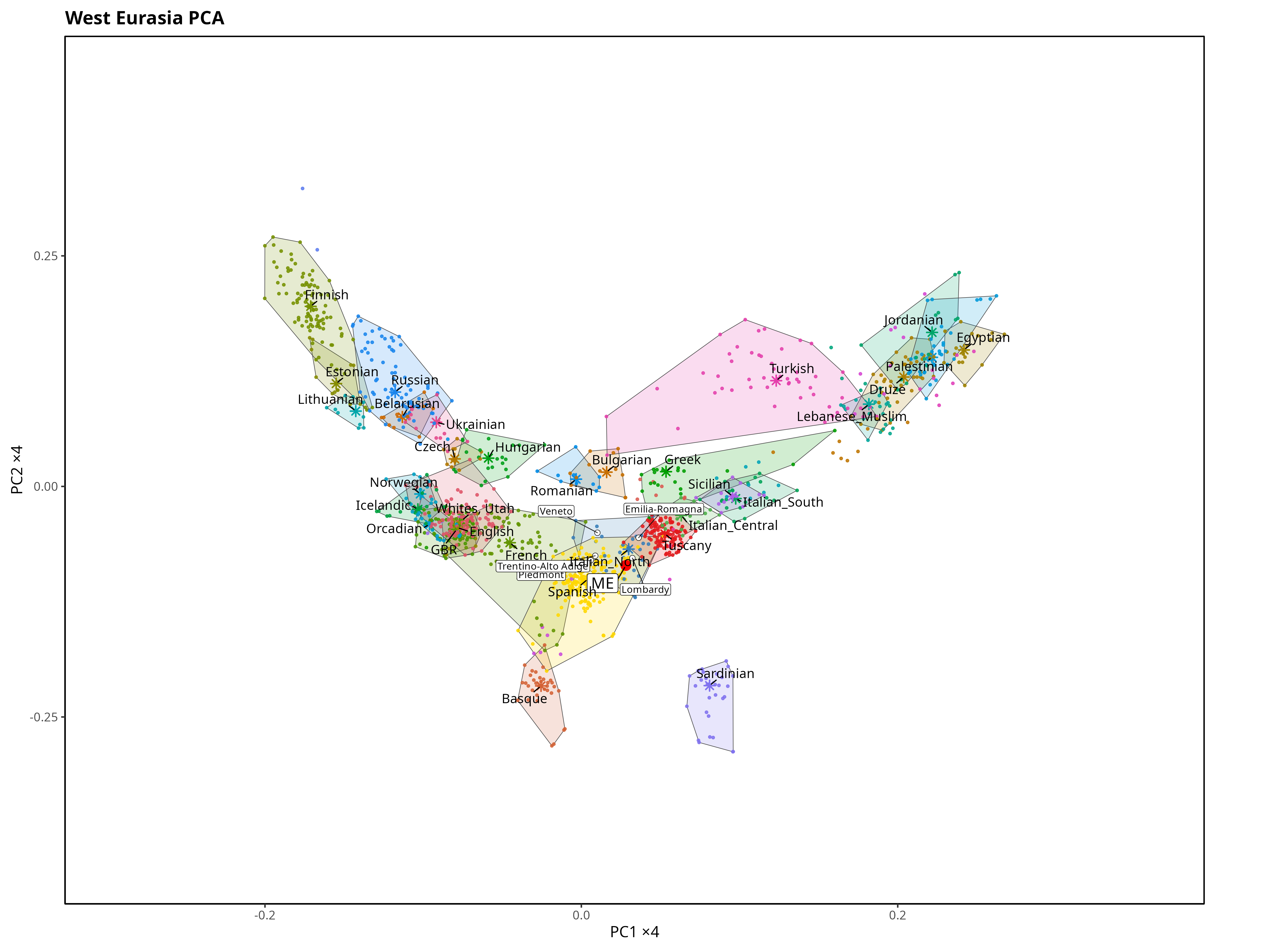 So I did a simple experiment. I took my 23andMe data and placed it on a reference panel of Europeans (plus Middle Eastern populations as an anchor). If family background tracks genome-wide similarity the way we expect, my point should fall right where it “should”: inside the Northern Italian cluster, not Central, let alone Southern Italian.