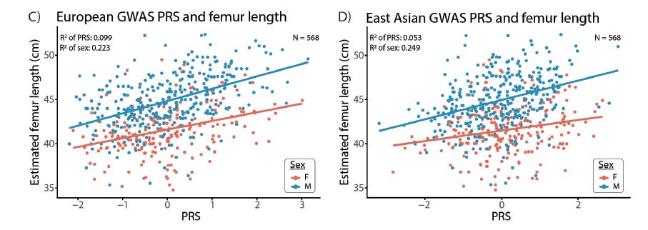 "The optimal PRS using European summary statistics explained R² = 0.099 of femur length variance(Fig. 1C).