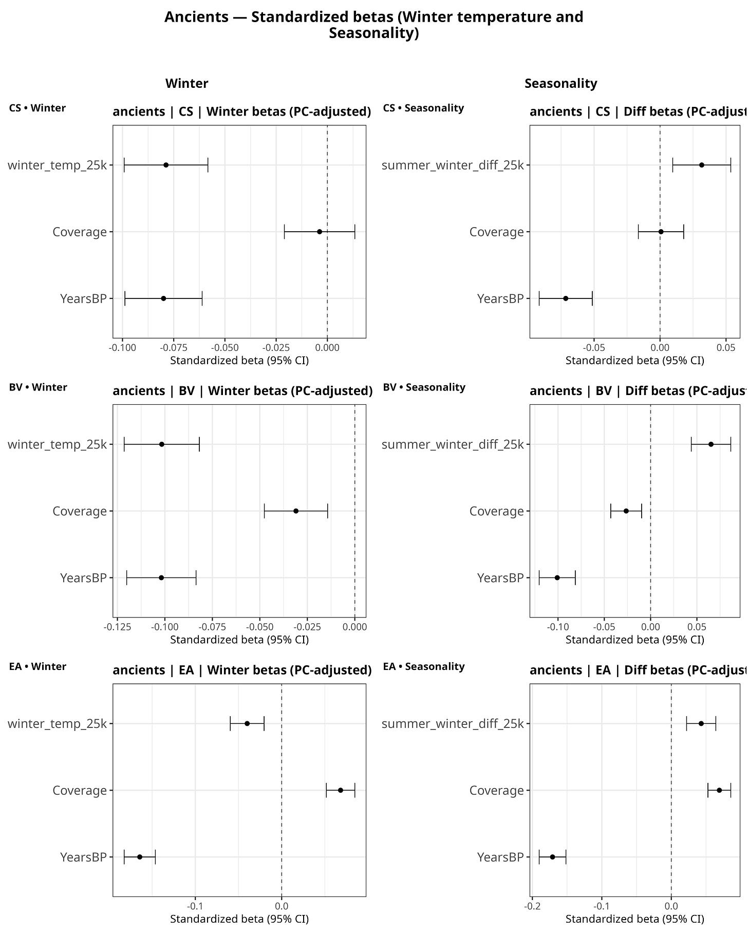 PGS ~ winter temperature + seasonality + Years BP + Coverage + 6 ancestry PCs.