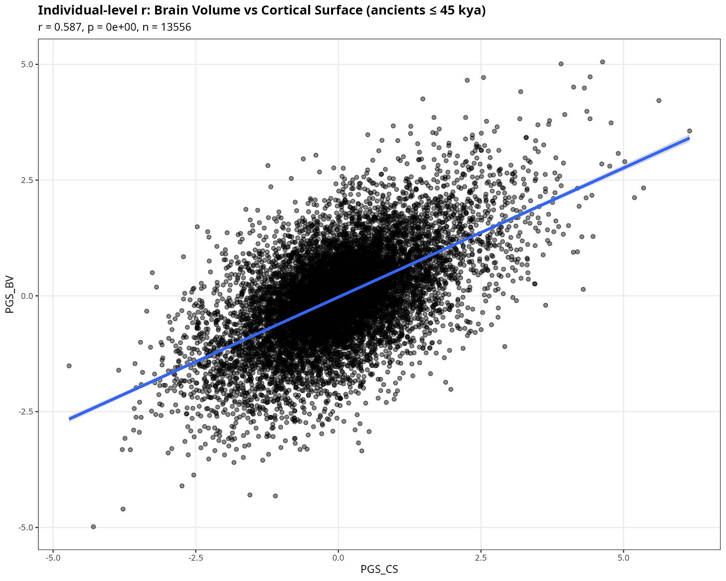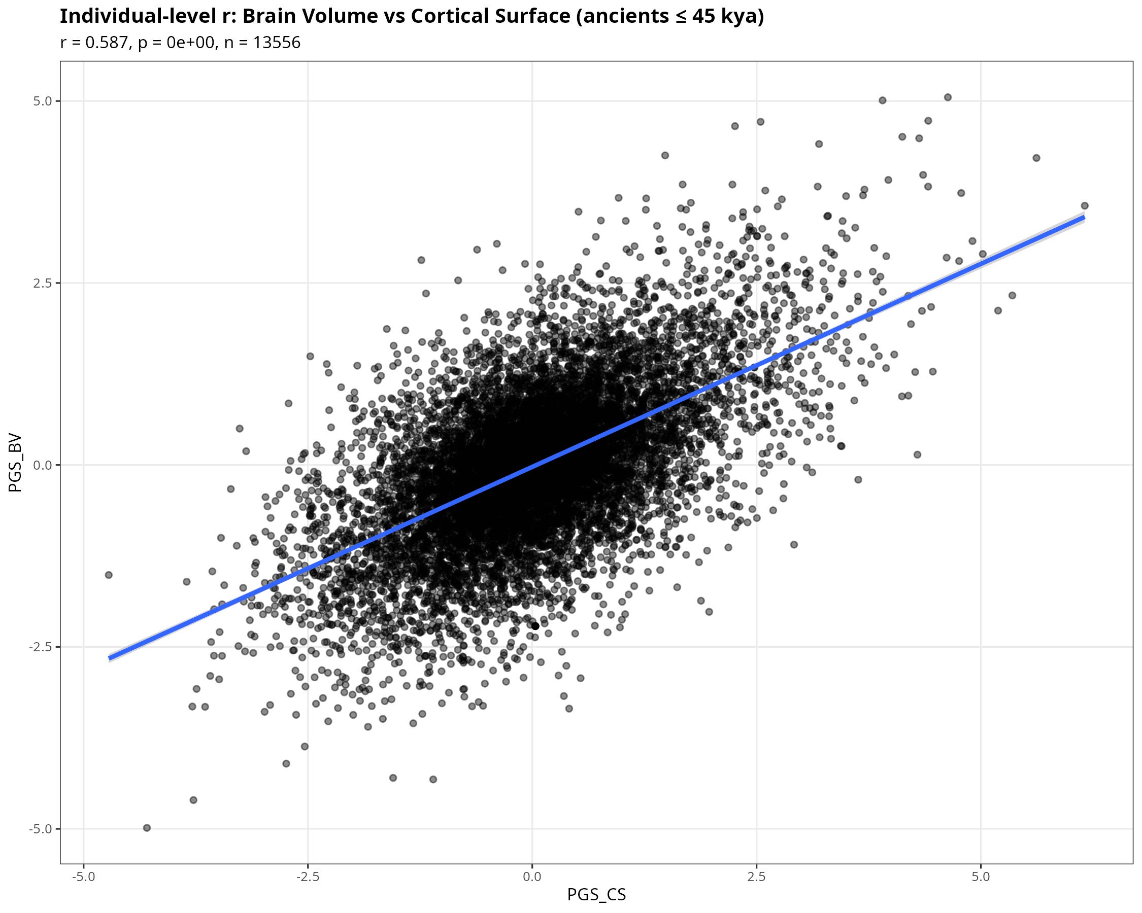 They do. Across individuals in the AADR sample (≤ 45,000 BP), the polygenic scores for brain volume (BV) and cortical surface area (CS) are strongly positively correlated (r ≈ 0.59). With more than thirteen thousand individuals, the p-value is effectively zero.