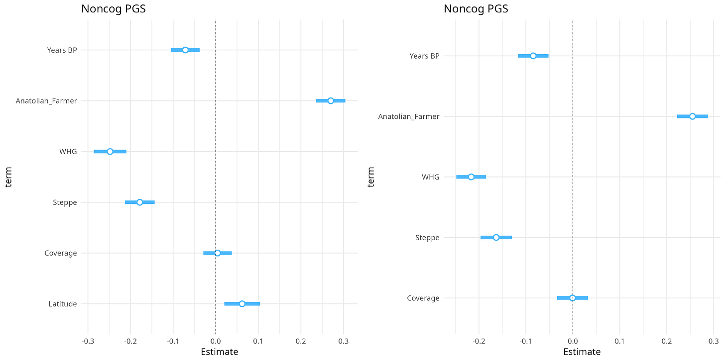 In this post I take that Cog and Noncog decomposition and apply it to ancient genomes by computing polygenic scores using the lead SNP lists reported by Demange et al. (2021) for the Cog and Noncog components.