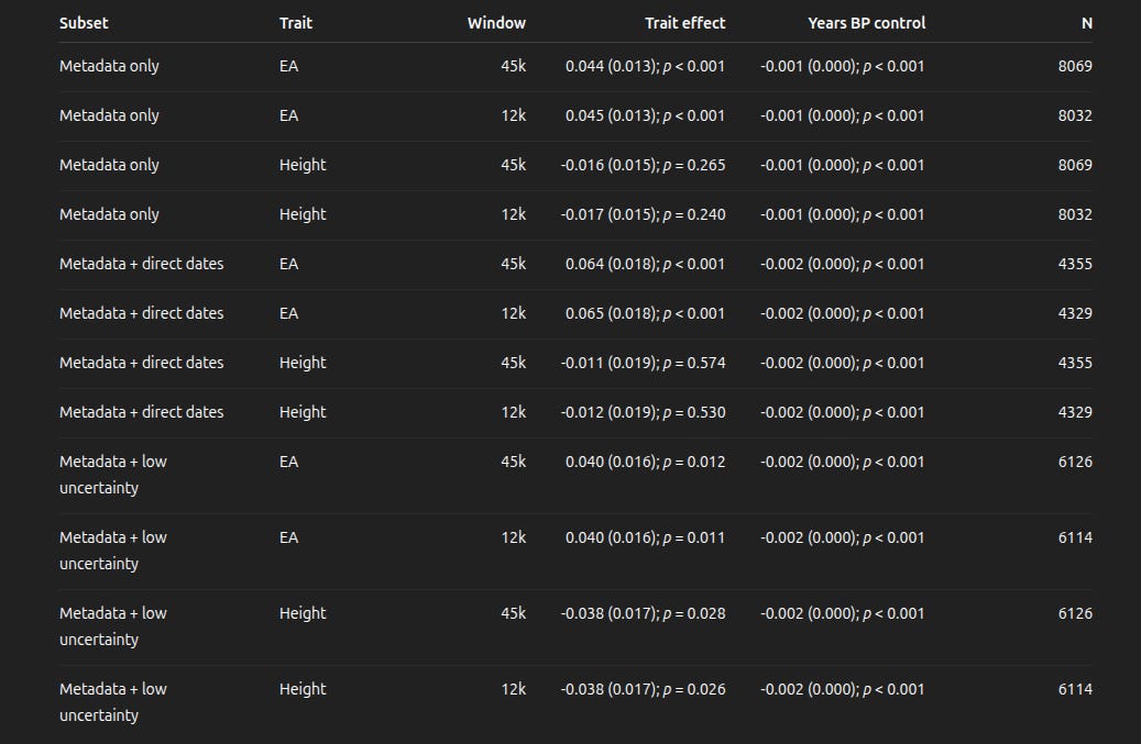 Table 1. Trait effects and Years BP controls across dating-quality subsets.