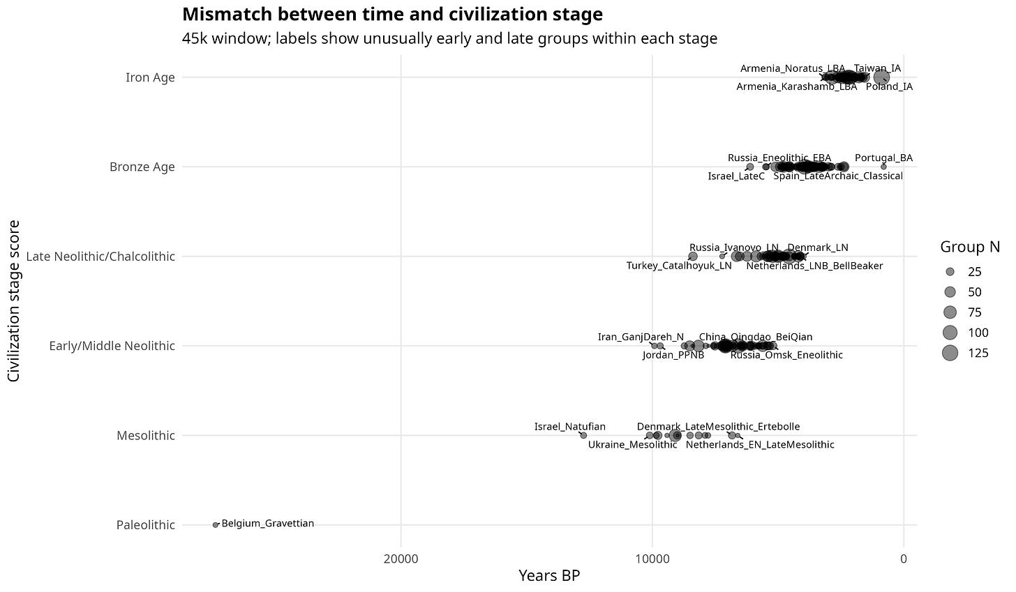 In an earlier post I used ancient individuals from the AADR dataset to assign each archaeological period a civilization-stage score and ask whether that score predicts educational-attainment polygenic scores even after controlling for absolute date. In practice, that meant coding Paleo-Mesolithic groups as 1, Neolithic groups as 2, Copper Age groups as 3, Bronze Age groups as 4, and Iron Age groups as 5.