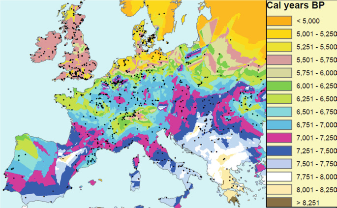 A map of the spread of agriculture makes the point immediately. The transition to farming did not unfold at a uniform pace across Europe. Some regions crossed into the Neolithic much earlier than others, while large parts of the continent remained outside it for centuries or millennia longer. That staggered transition is exactly what makes the present analysis possible. If different populations occupied different civilizational stages at the same broad date, then archaeological stage and chronology can, at least in principle, be pulled apart.