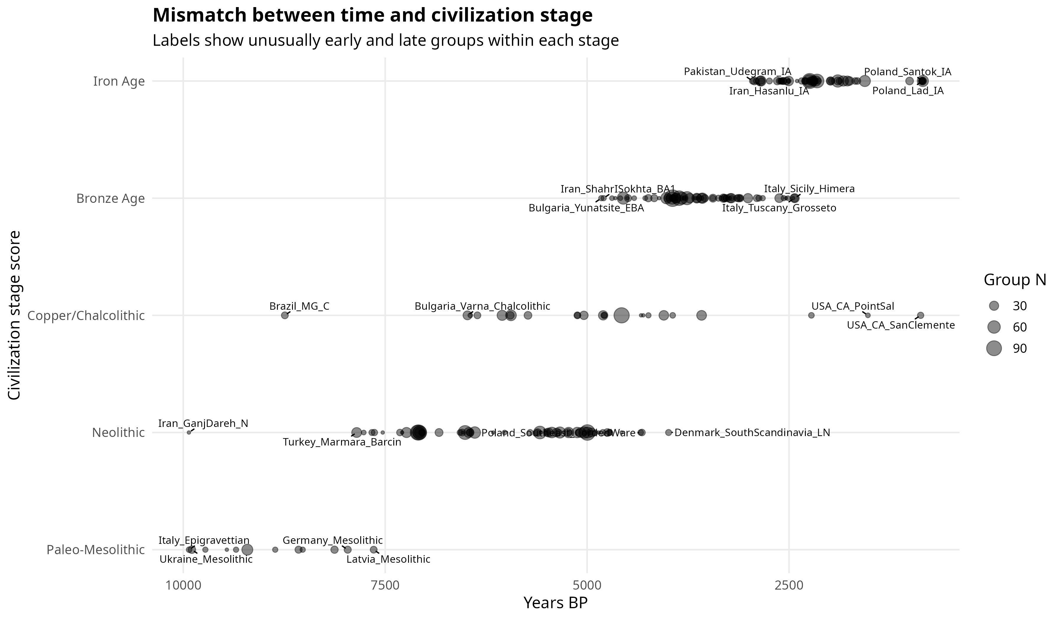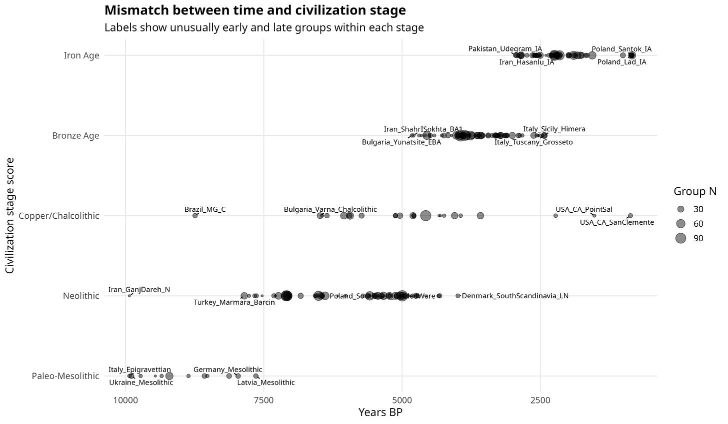 Archaeological stage and calendar date are correlated, but far from perfectly. Populations living at similar dates can occupy very different civilizational positions, and populations assigned to the same broad stage can be separated by long stretches of time. This can be seen in the figure below.