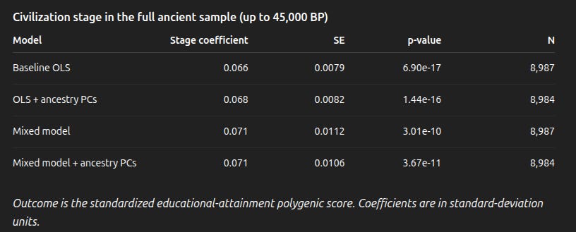 I'm not testing their mechanism directly but the question points in the same direction. If traits linked to educational attainment were historically relevant to the capacity of populations to sustain more complex forms of life, then archaeological stage should retain some predictive power even after absolute time is held constant. In that sense, the civilization-stage score is crude, but it is also useful. It is a rough proxy for where a population stood in the long transition from simple subsistence regimes to more knowledge-intensive and organizationally demanding societies.