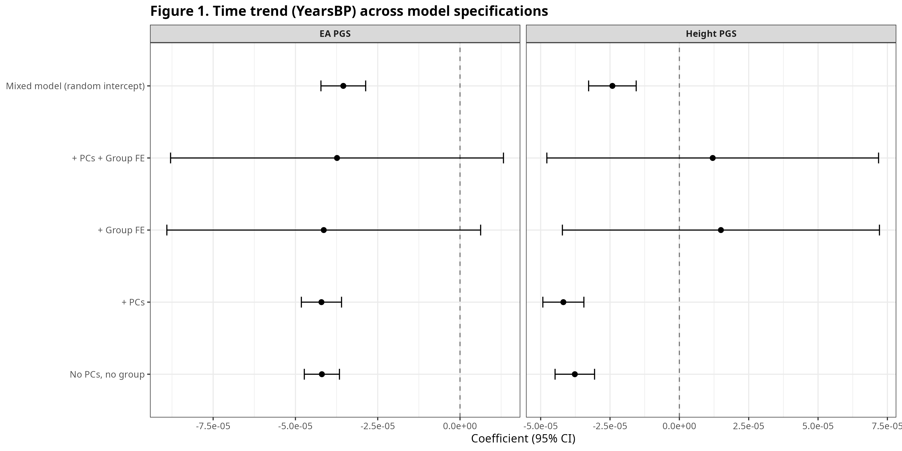 Figure 1 plots the coefficient on YearsBP (years before present) across a ladder of models for EA PGS and Height PGS: minimal controls, then ancestry PCs, then group fixed effects, then a mixed model.