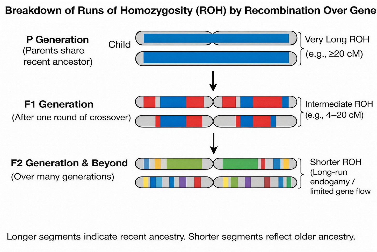 The schematic below shows how recombination shortens shared segments over generations. In real populations, intermediate-length ROH usually arise not from a single distant cousin pair, but from long-standing endogamy and limited gene flow across many generations.