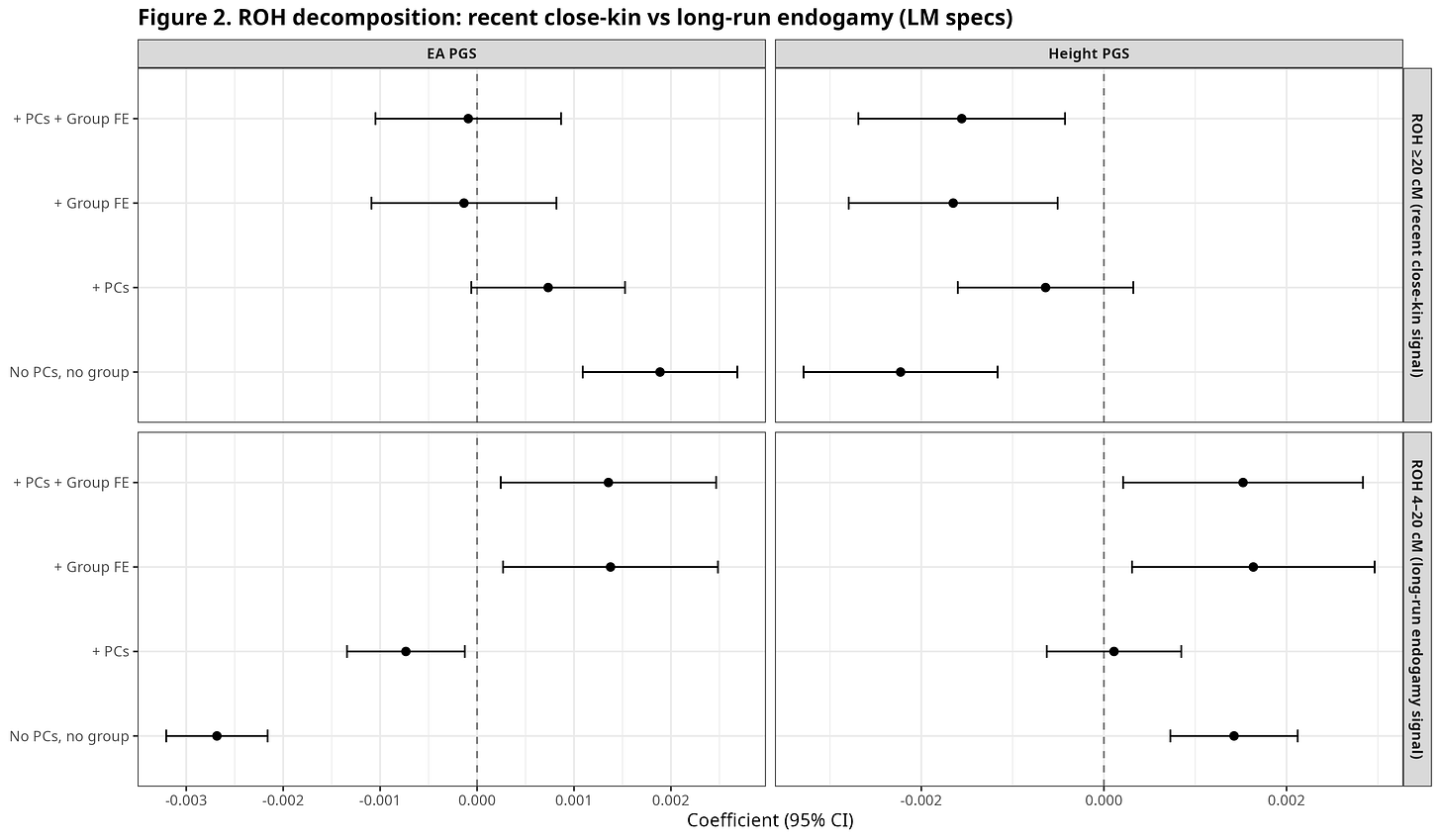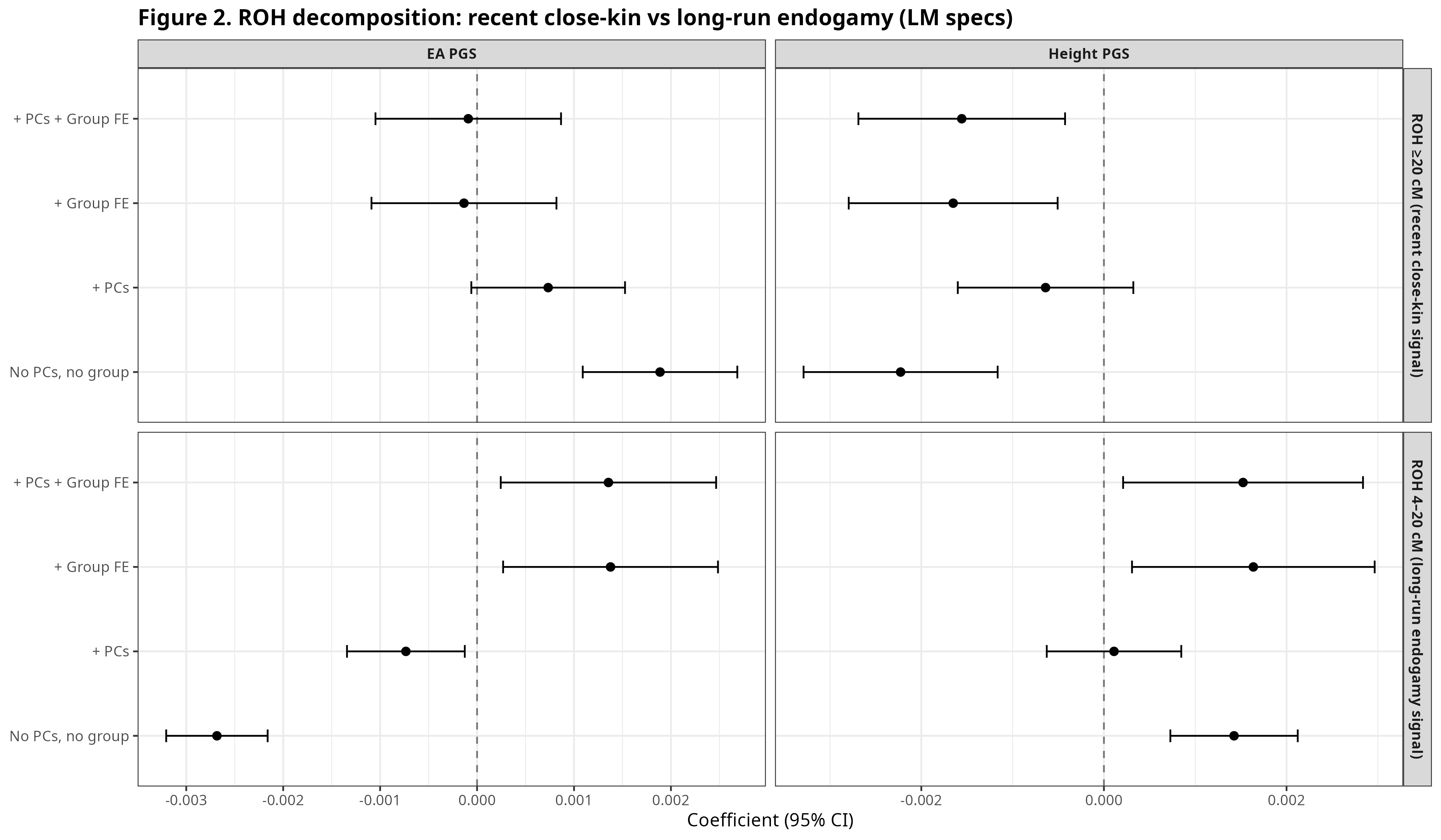 The two ROH bins show different associations. ROH ≥20 cM is often negatively associated with the scores, most clearly for Height once group structure is included. ROH 4–20 cM behaves differently. For EA, the 4–20 cM coefficient varies across specifications, suggesting that between-group and within-group variation are not aligned.