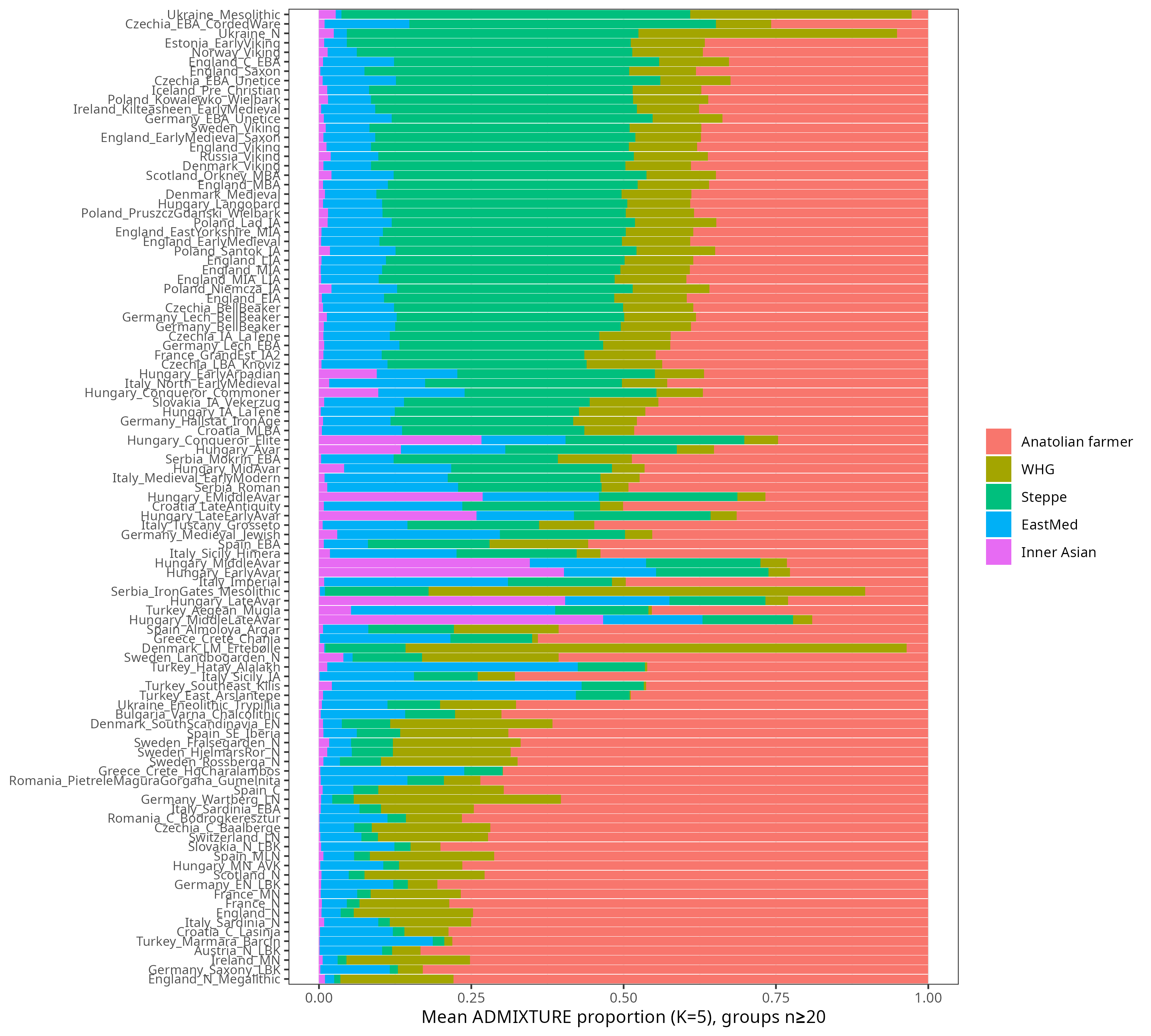 The figure below shows the average ancestry composition of ancient population groups with at least twenty individuals using this 4+1 framework. Population groups are ordered by the proportion of Steppe ancestry, highlighting how Steppe ancestry spreads across time and regions.