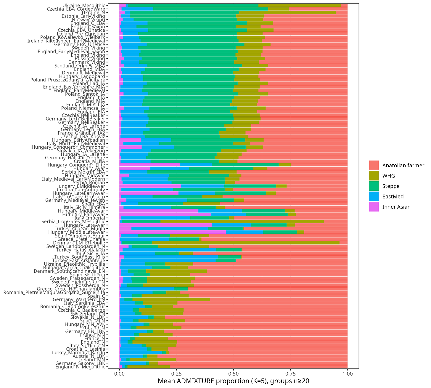 Figure 1. Mean ancestry composition of ancient European population groups (K=5 ADMIXTURE, Europe’s “4+1” ancestries).