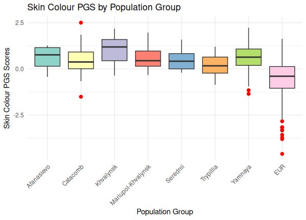 This can be seen from the plot below, comparing Skin Colour polygenic scores, which shows modern Europeans (EUR from 1KG) have lighter skin than all the other ancient groups: