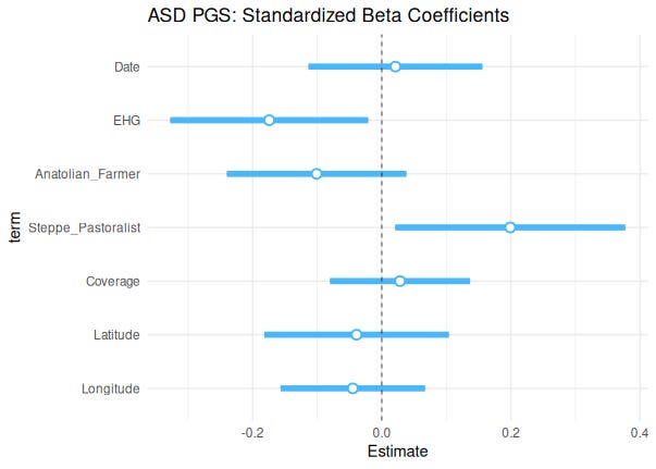 Intriguingly, Steppe ancestry, also came with higher polygenic scores for autism spectrum disorder (ASD). Far from being a liability, many of these genetic variants are also associated with strengths in systemizing, attention to detail, and abstract thinking. The effect of Steppe Pastoralist ancestry can be seen in a regression with ASD PGS as the dependent variable, ancestry components, coverage and Date as predictors: