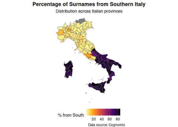Using TF-IDF (a text-analysis method adapted for surnames), I mapped how much each Italian province’s surname pool reflects historical migration from other regions—particularly the south. The results? A striking north-south gradient in both ancestry and modern standardized test scores.