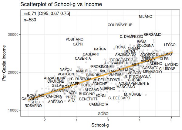 A robust literature demonstrates that cognitive abilities - whether measured through educational attainment or IQ - powerfully predict individual (Schmidt & Hunter, 2004; Strenze, 2007) and national income (Hanushek & Woessmann, 2008; Lynn & Vanhanen, 2002). My data reveals this fundamental relationship plays out across Italian municipalities with striking clarity: