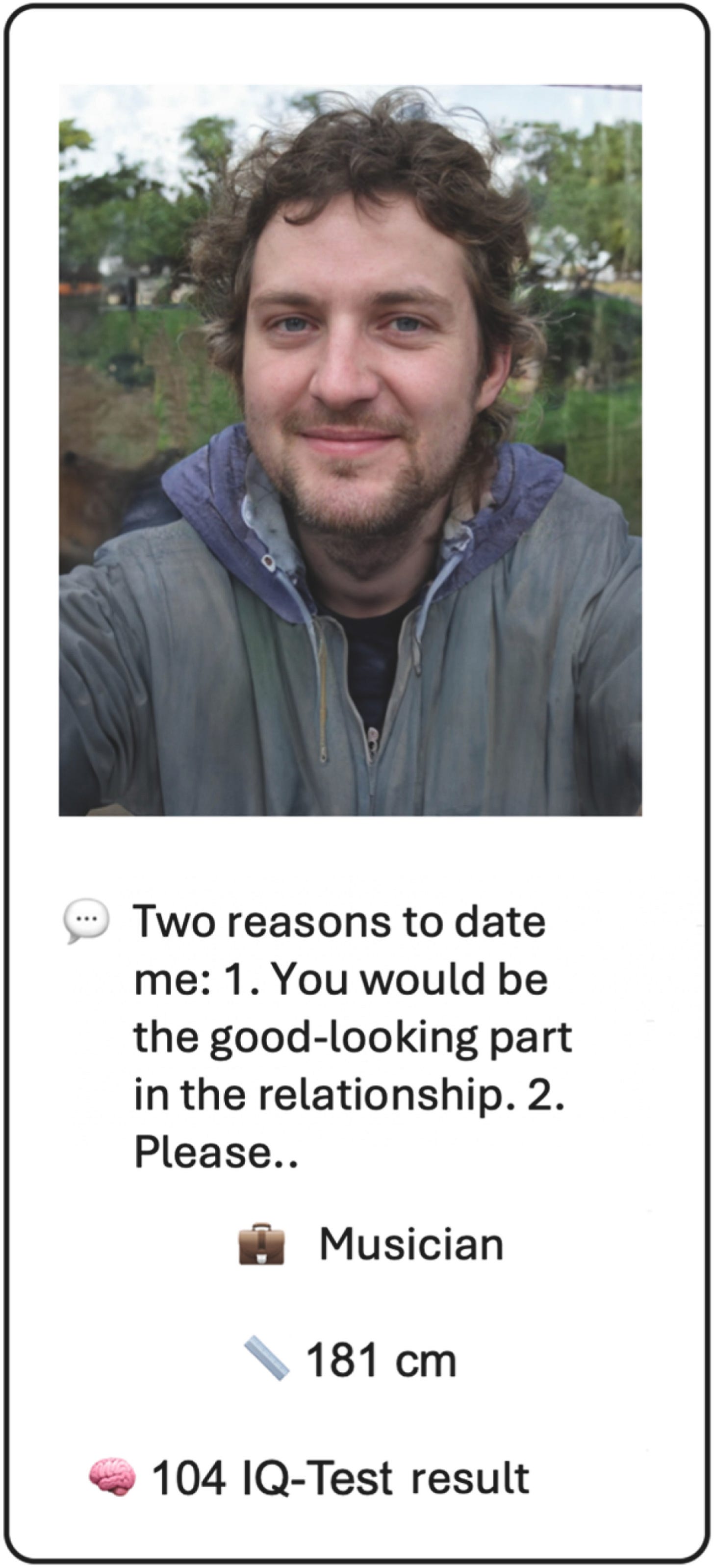 A 2025 study by Witmer, Rosenbusch, and Meral brought these findings into the modern dating landscape. Instead of using real profiles, the researchers constructed synthetic ones. Each profile combined an AI-generated photo (from This Person Does Not Exist and Ideogram) with attributes like height, occupation, and a short biography (adapted from anonymized Tinder texts).