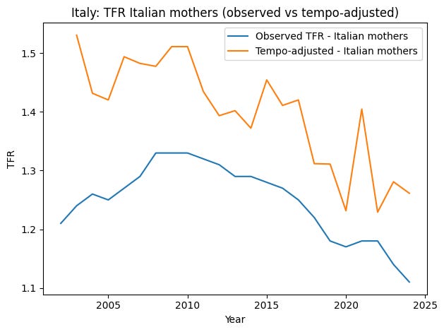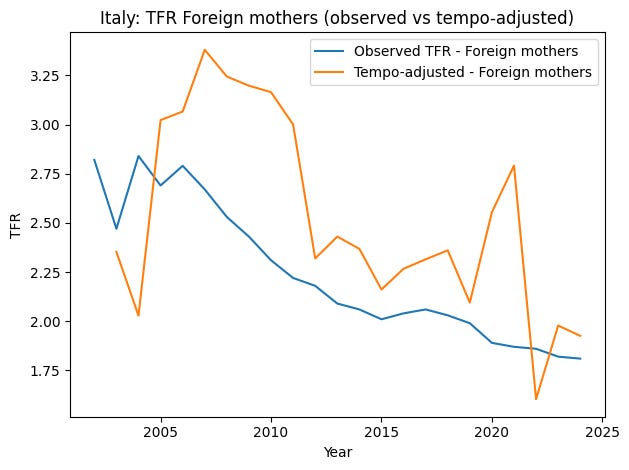 Foreign mothers still have higher fertility, but the downward trend is clear for both groups. When the same tempo adjustment is applied separately to Italian and foreign mothers, the conclusion remains the same: the post-2010 decline is not mainly a timing effect. It represents a genuine reduction in fertility levels.
