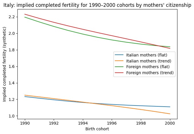 To understand the longer-term implications, I reconstructed synthetic age-specific fertility schedules using observed TFR and mean age at childbirth by citizenship. From these, I estimated implied completed fertility for cohorts born between 1990 and 2000 under two scenarios: one in which fertility stabilizes at 2024 levels, and one in which recent trends continue.