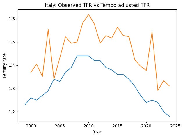 To answer that, I applied the standard Bongaarts–Feeney adjustment, which corrects period TFR for annual changes in the mean age at childbirth. If postponement is driving the decline, the tempo-adjusted TFR should fall less than the observed TFR. Removing timing effects should shrink the apparent drop.