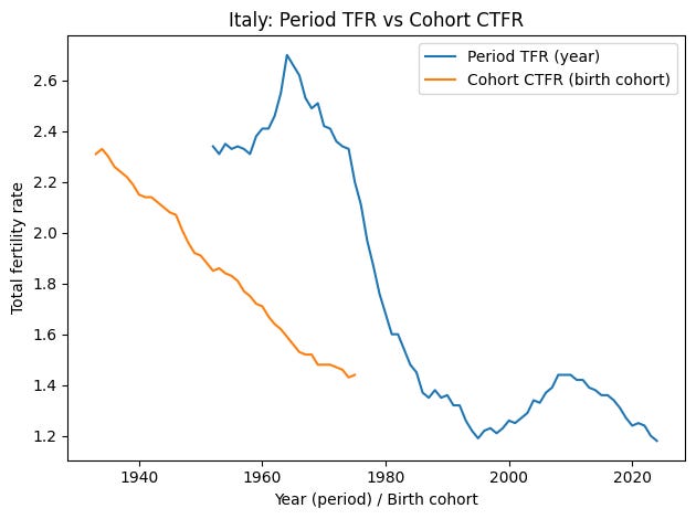 If cohorts born around 2000 ultimately complete at close to one child per woman, Italy will not merely be experiencing a cyclical trough. It will have moved into a new demographic equilibrium.