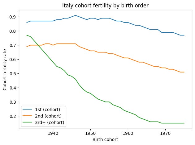 In Italy, cohort fertility declined gradually from around 2.3 children for women born in the early 1930s to roughly 1.4 for those born in the mid-1970s. That long decline was driven overwhelmingly by the disappearance of third and higher-order births. Italy did not suddenly become a society of childlessness; rather, it became a society in which large families ceased to be the norm.