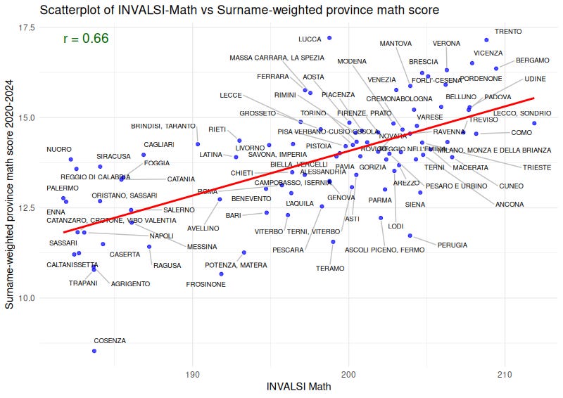 r = 0.57 correlation with provincial math scores (Italy's national standardized tests given to all students).
