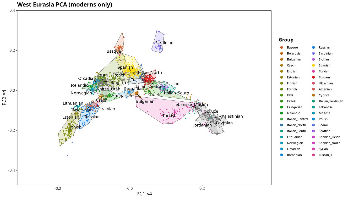 On a standard European PCA, Northern and Southern Italians are clearly distinguishable, but also close. Central Italy sits between them, as expected. The distances involved are modest compared with Italy versus Finns or Middle Easterners. However, Northern Italy is closer to Northwestern Europe, and partially overlapping with Spain.