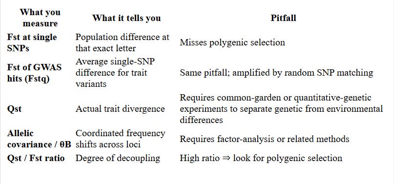 Bottom line: Qst ≠ Fst for polygenic traits under selection. Bird’s paper is therefore not evidence against a genetic contribution to group differences; it is a textbook illustration of why confusing the violin’s volume with the orchestra’s leads to the wrong crescendo.