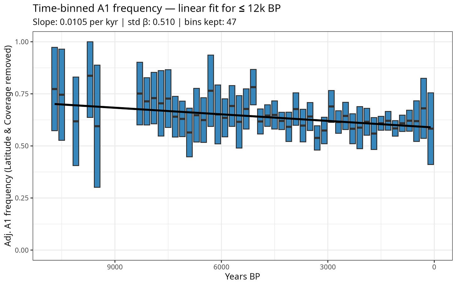 TL;DR: When we track the top genome-wide hit from Abdellaoui et al., 2025, its frequency declines toward the present across ancient Eurasian genomes. After adjusting for latitude and coverage and binning samples in 500-year windows ≤12k BP, a simple weighted regression shows a negative time trend (slope ≈ 0.0105 per kyr in “years BP” coordinates; i.e., higher in the deeper past, lower today). The standardized effect size on these binned means is β ≈ 0.51.