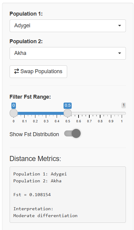 Distance Metrics Display: Shows the Fst value and interpretation for your selected pair