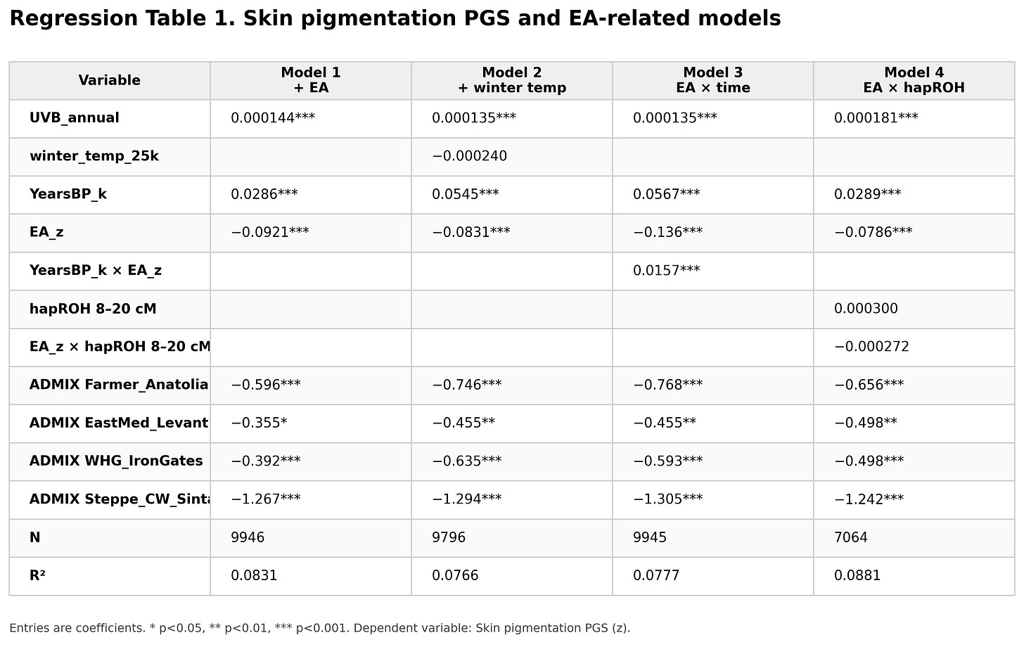 The table below reports the main regression results. The expected variables behave as they should: UVB predicts darker pigmentation, older samples have darker scores, and deep ancestry components matter. But another coefficient appears repeatedly across the models: higher educational-attainment PGS is associated with lighter pigmentation alleles.