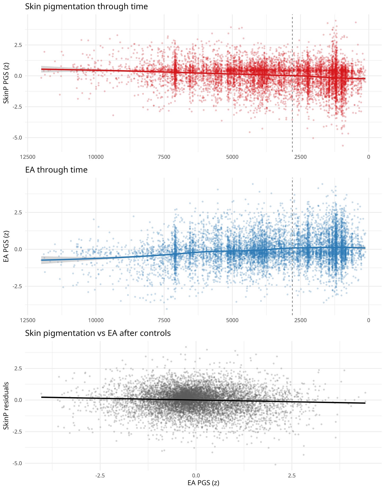 To visualize the pattern, the figure below shows three views of the data. The top panel plots skin pigmentation scores through time, while the middle panel shows the corresponding trajectory for educational-attainment PGS. The bottom panel examines the relationship directly: skin pigmentation residualized on UVB, climate, ancestry, and population structure plotted against EA PGS. Even after removing those factors, individuals with higher EA scores tend to carry alleles associated with lighter pigmentation.