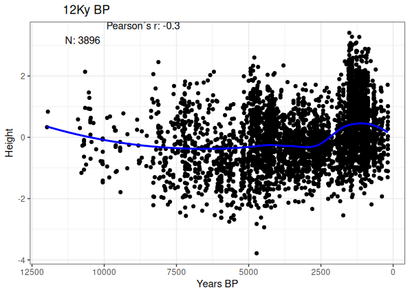 Our scatterplot reveals a fascinating pattern - human heights remained relatively stable for millennia after the agricultural transition, with strong selection for increased height only emerging around 3,000 years ago. (An important caveat: earlier periods may be biased by overrepresentation of Southern European samples, who tend to be genetically shorter).