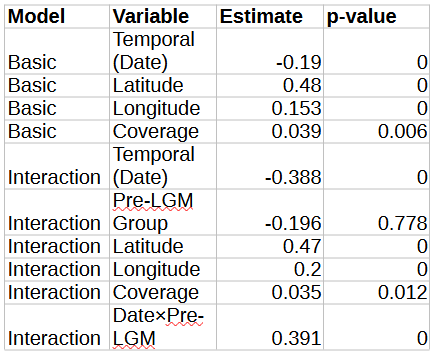 A linear regression of height PGS against time, latitude, longitude, and coverage reveals key trends: