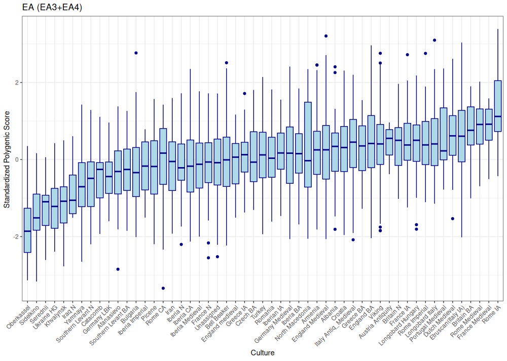 As the chart below shows, Hunter-Gatherers had the lowest Educational Attainment/Cognitive abilities PGS: