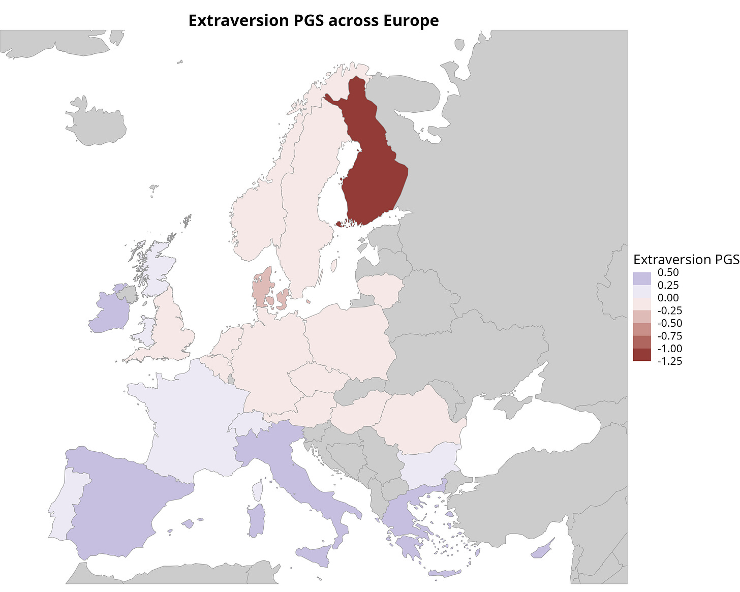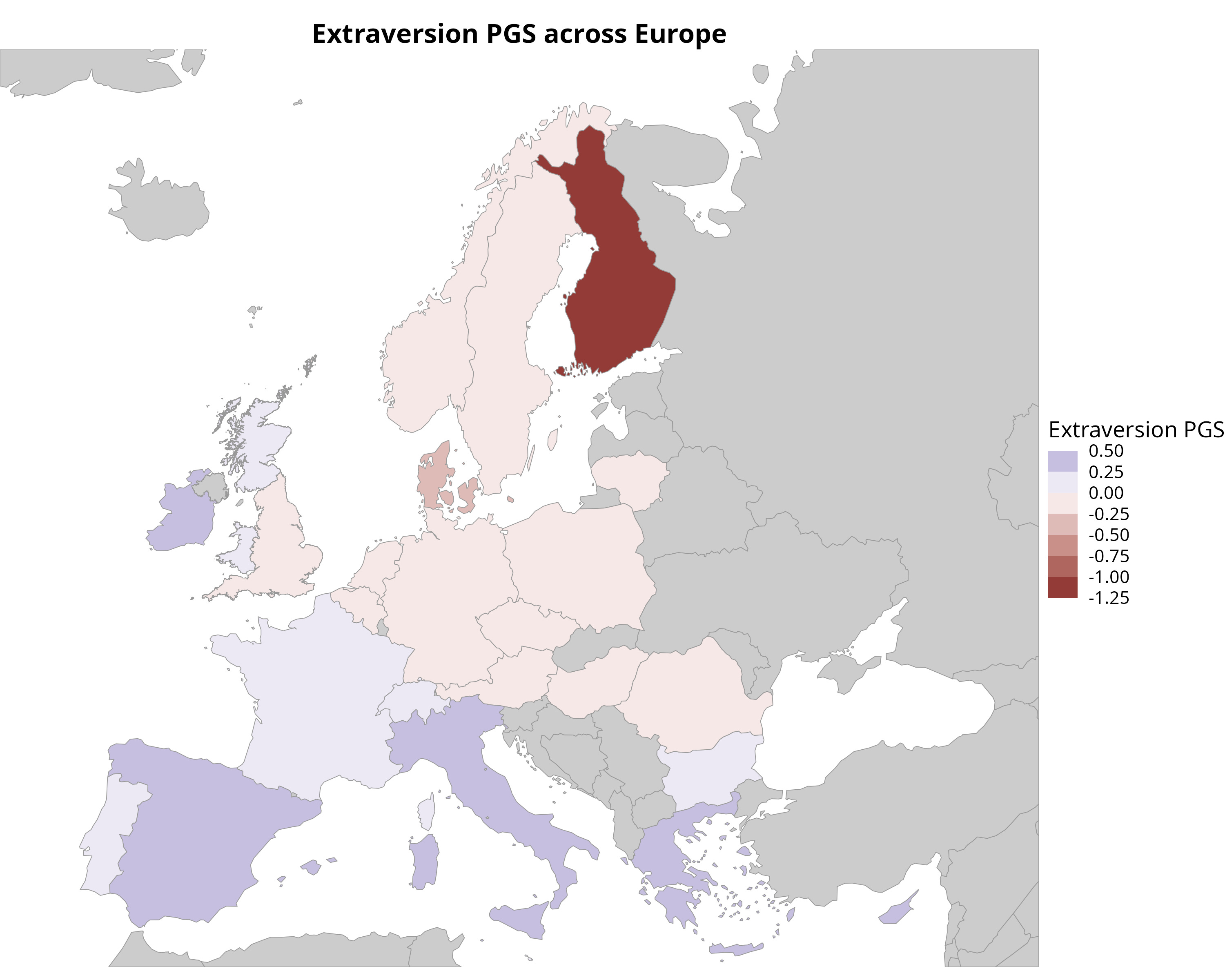 The map below shows Europe colored by the standardized extraversion PGS, averaged by country. Countries without data are grey. I also compress extreme outliers visually so the mid-range variation (where most countries lie) is easy to see.