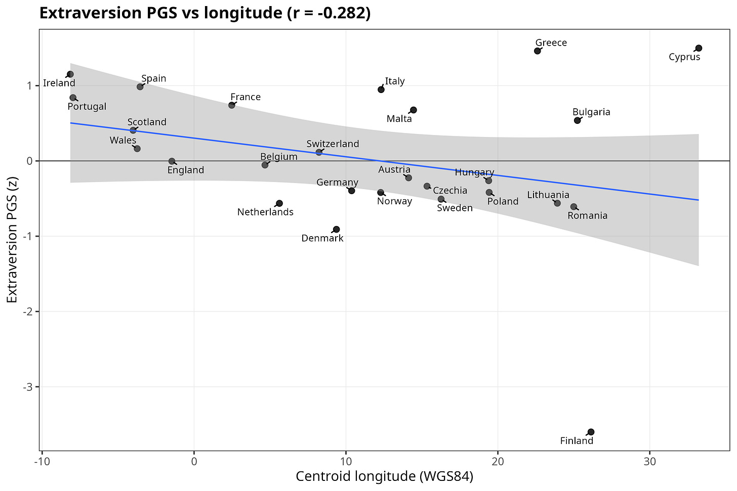 An east–west pattern shows up alongside the north–south one. At similar latitudes, western populations tend to score a little bit higher on the extraversion PGS than eastern ones. That helps explain why the “reserved North” stereotype fits Finland far better than Ireland, even though both are northern.